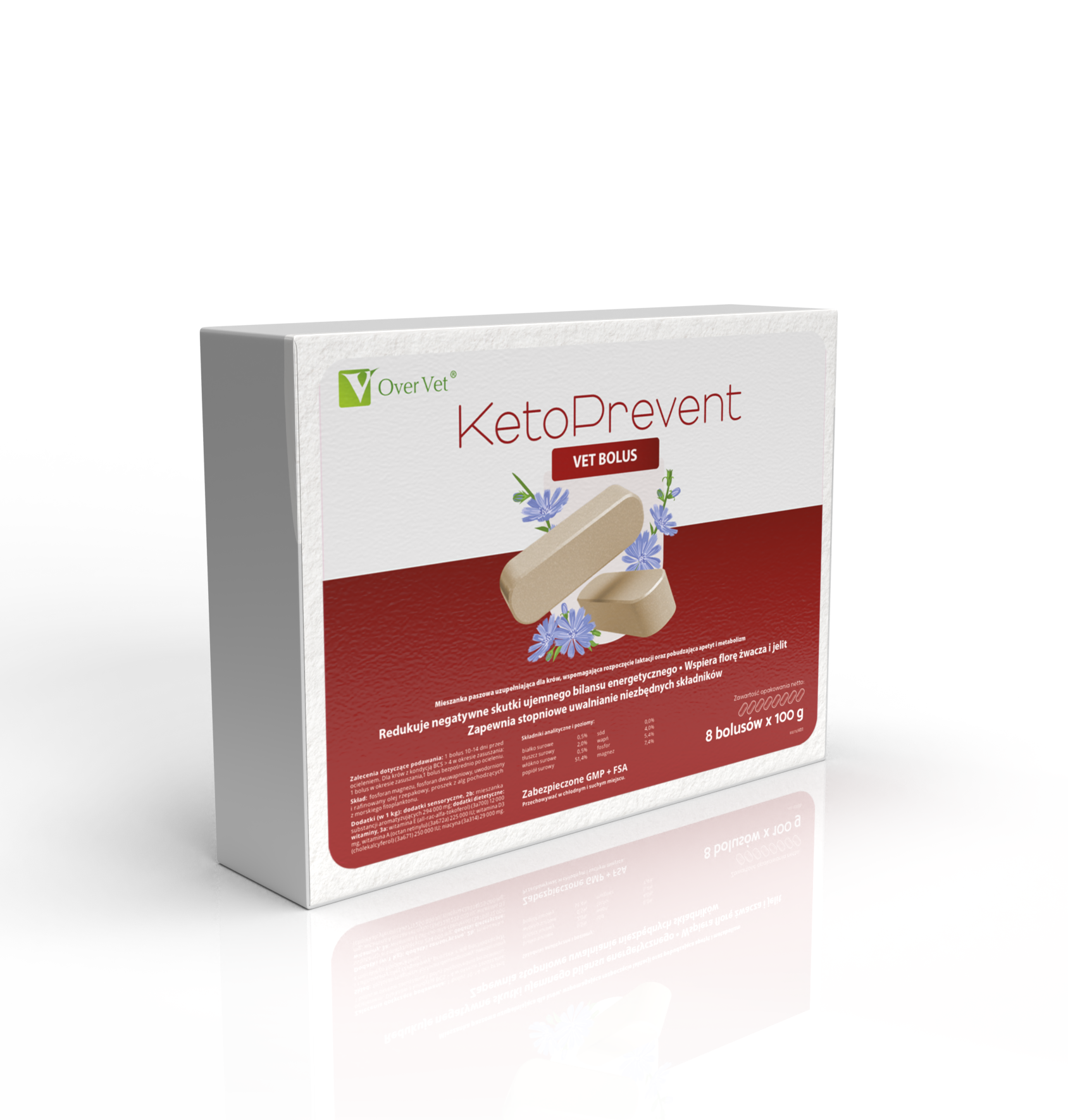 KETOPREVENT VET BOLUS skutecznie wspomaga kluczowe funkcje metaboliczne i trawienne, minimalizując ryzyko ketozy. Unikalna formuła produktu, oparta na wyselekcjonowanych komponentach, zapewnia powolne i kontrolowane uwalnianie substancji aktywnych w żwaczu przez okres do 50 dni. Zawarte w bolusie taniny i chlorella vulgaris wspierają zdrowy mikrobiom żwacza, działają przeciwutleniająco i immunomodulująco. Niacyna sprzyja efektywnemu wykorzystaniu ciał ketonowych i poprawie konwersji energii w organizmie, drożdże wspierają proces fermentacji w żwaczu. Inulina pochodząca z cykorii to prebiotyk o działaniu wspomagającym wzrost korzystnej mikroflory w przewodzie pokarmowym, poprawiając trawienie. Witaminy stymulują układ odpornościowy, zapewniają zdrowotność wymienia oraz prawidłowy metabolizm wapnia i fosforu.